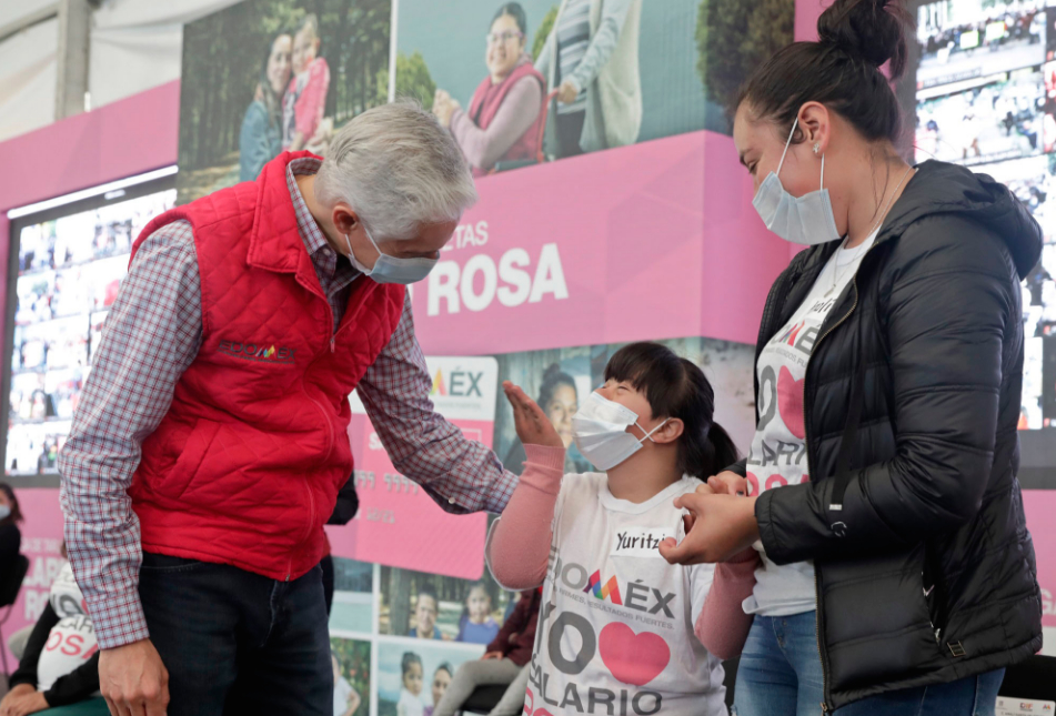 TOLUCA, ESTADO DE MÉXICO.- El Gobernador Alfredo Del Mazo Maza entregó tarjetas del “Salario Rosa” a mujeres embarazadas y en periodo de lactancia, así como a jefas de familia que tienen hijos con alguna discapacidad, a quienes les reconoció y agradeció el trabajo que llevan a cabo para sacar adelante a sus familias. “Nos da